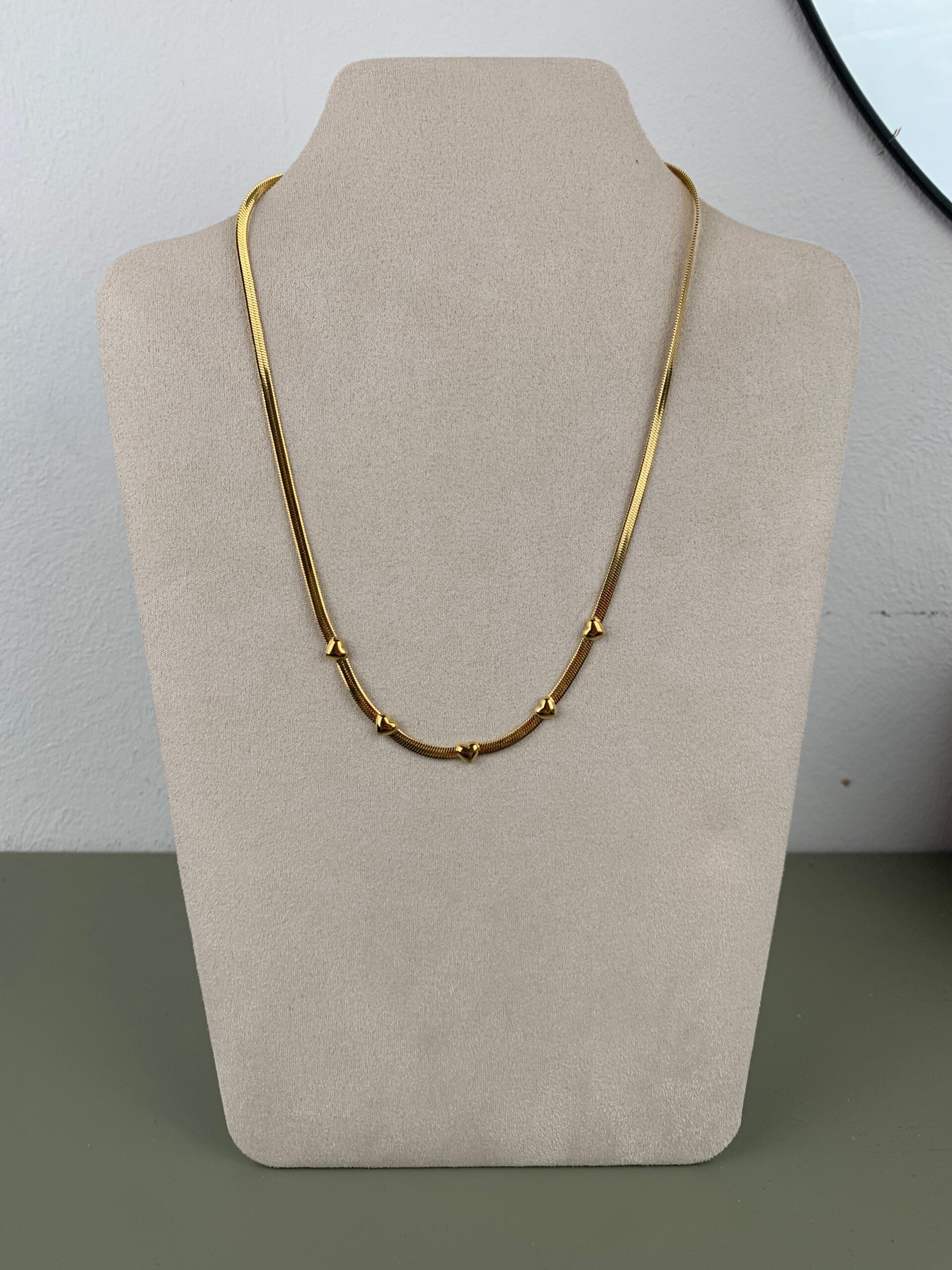 De ketting heeft een platte schakel en daarnaast nog hartjes erop, dit zorgt voor een erg chique detail. Stijl de ketting af met andere kettingen met hartjes.